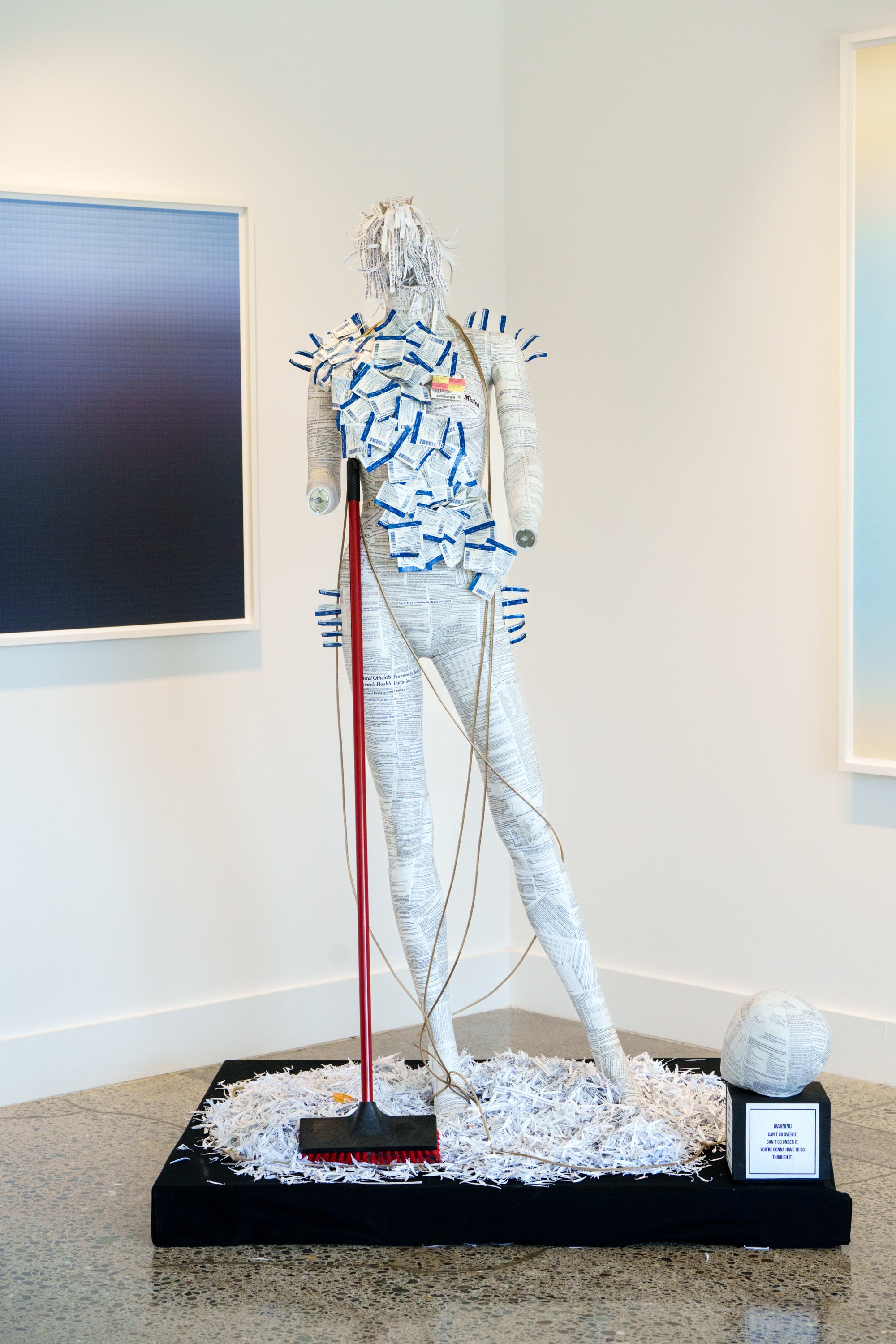 This sculpture embodies the mental and physical ideals we and society hold ourselves to, the overwhelming morass of information we are exposed to, and the interventions we use to keep ourselves together as we re-imagine a new ideal.