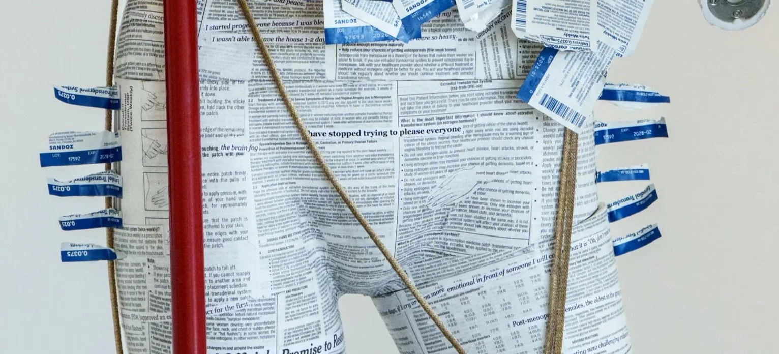 With a regimen of changing my patch twice a week and taking progesterone for the first 12 days of each month I started accumulating prescription packaging. I interviewed more friends to understand how they felt they were being treated medically, socially, and emotionally as they go through the menopause transition. Many of those quotes are on this sculpture. I also started looking closely at the packaging inserts filled with tiny print including that “black box” warning you may have read about, a hangover from the controversial Women’s Health Initiative study.